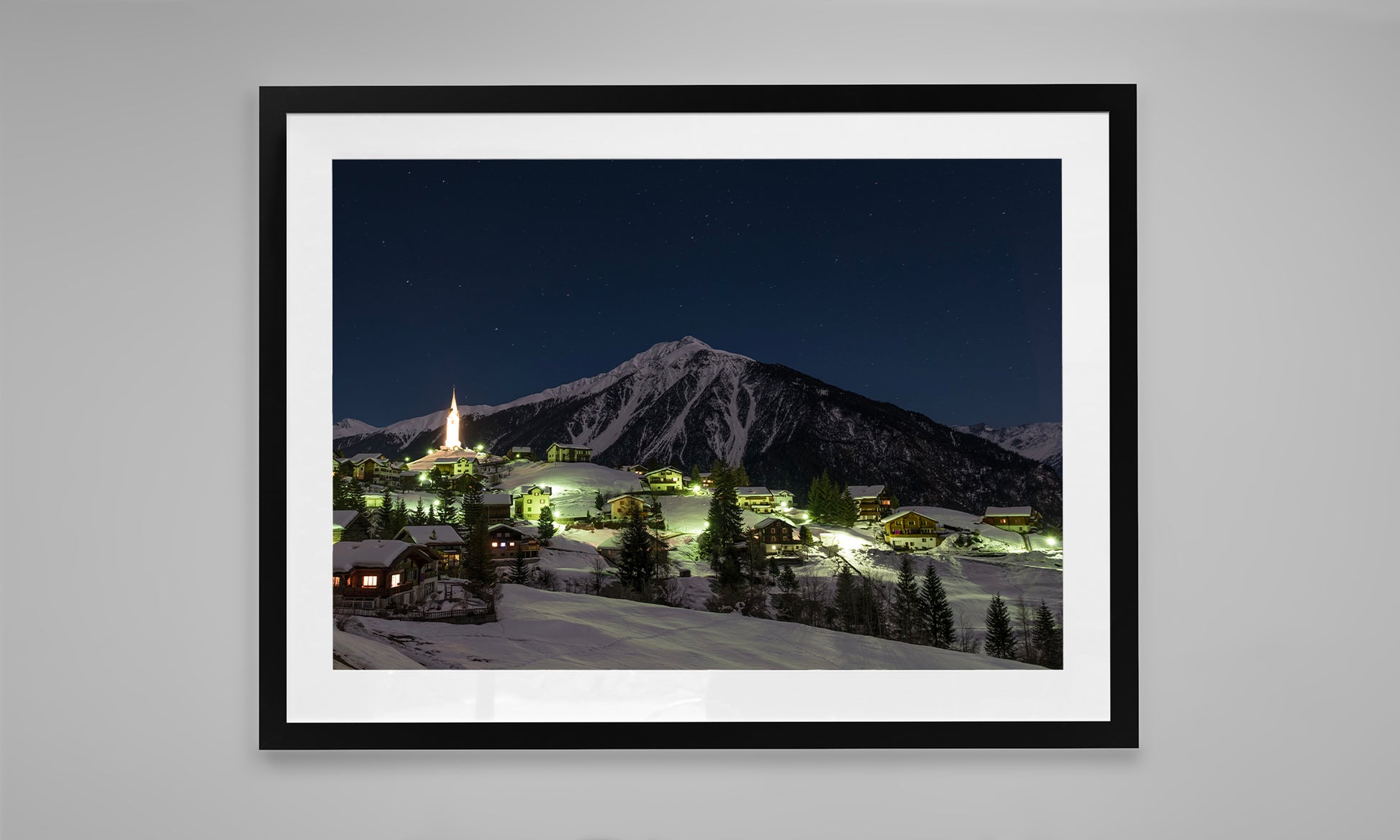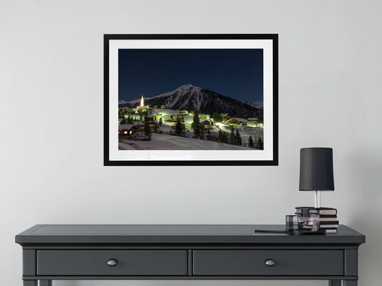As night settles over Santa Maddalena, the village lights softly illuminate the snow-covered hillside. The church spire glows against the darkness, while the dramatic peaks of the Dolomites rise quietly behind it.