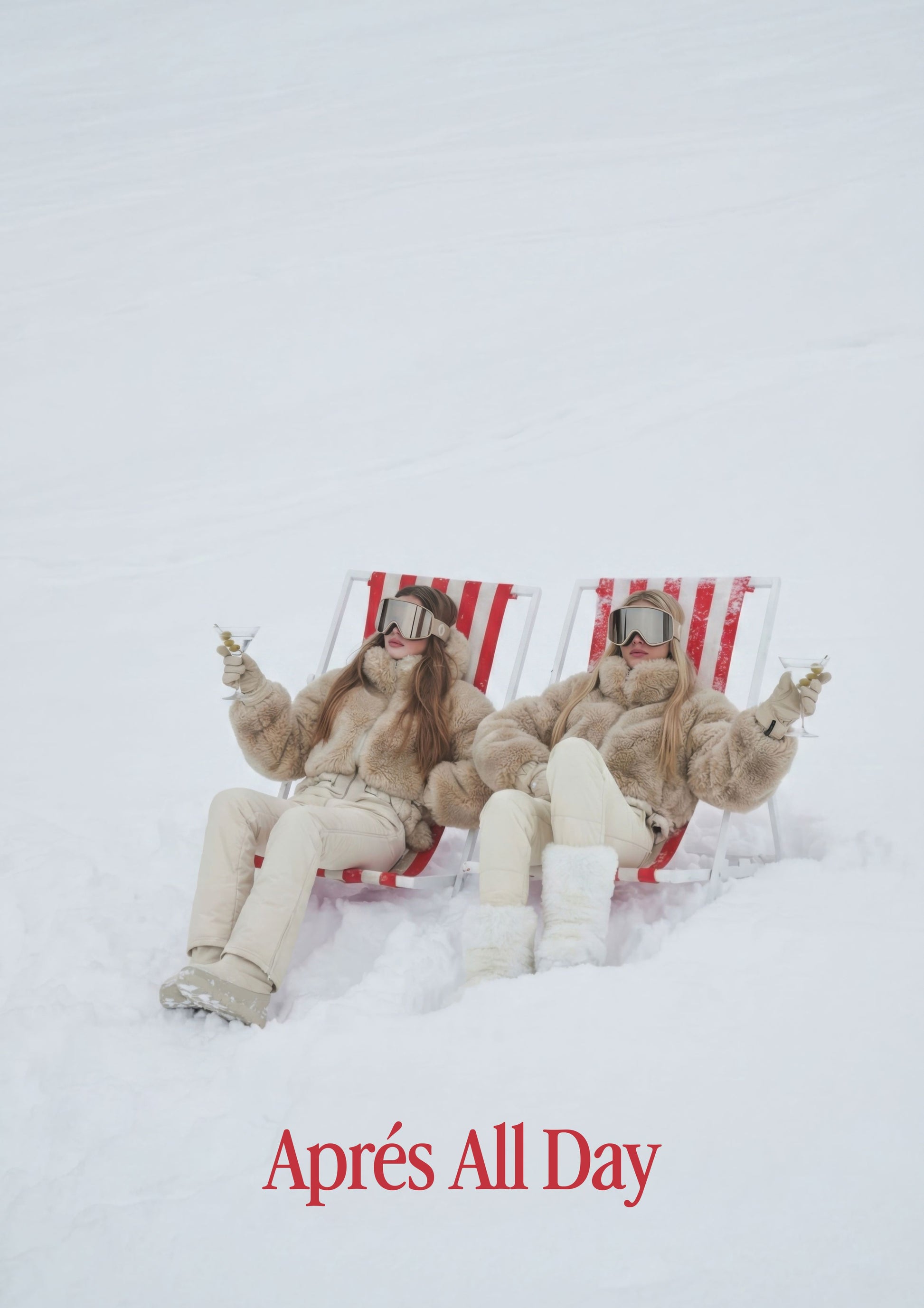 This relaxed alpine scene celebrates the softer side of ski culture — long lunches, chilled martinis, and doing absolutely nothing in impeccable style. With its muted palette, cosy textures, and tongue-in-cheek attitude, this image is effortlessly cool and quietly indulgent.
