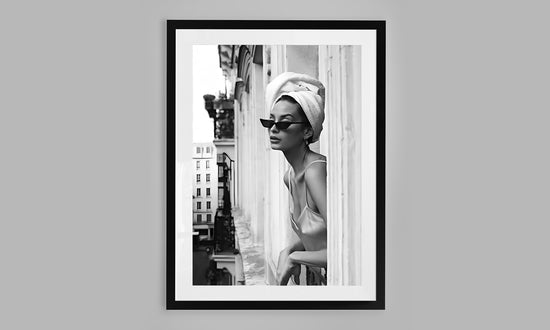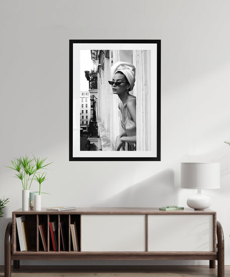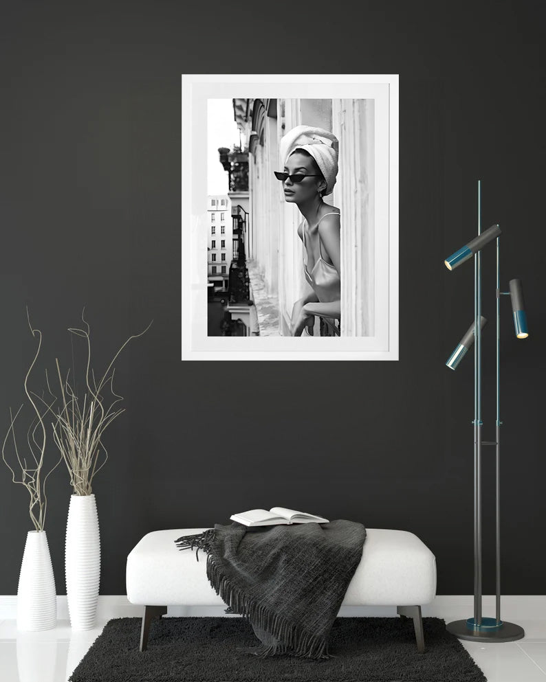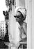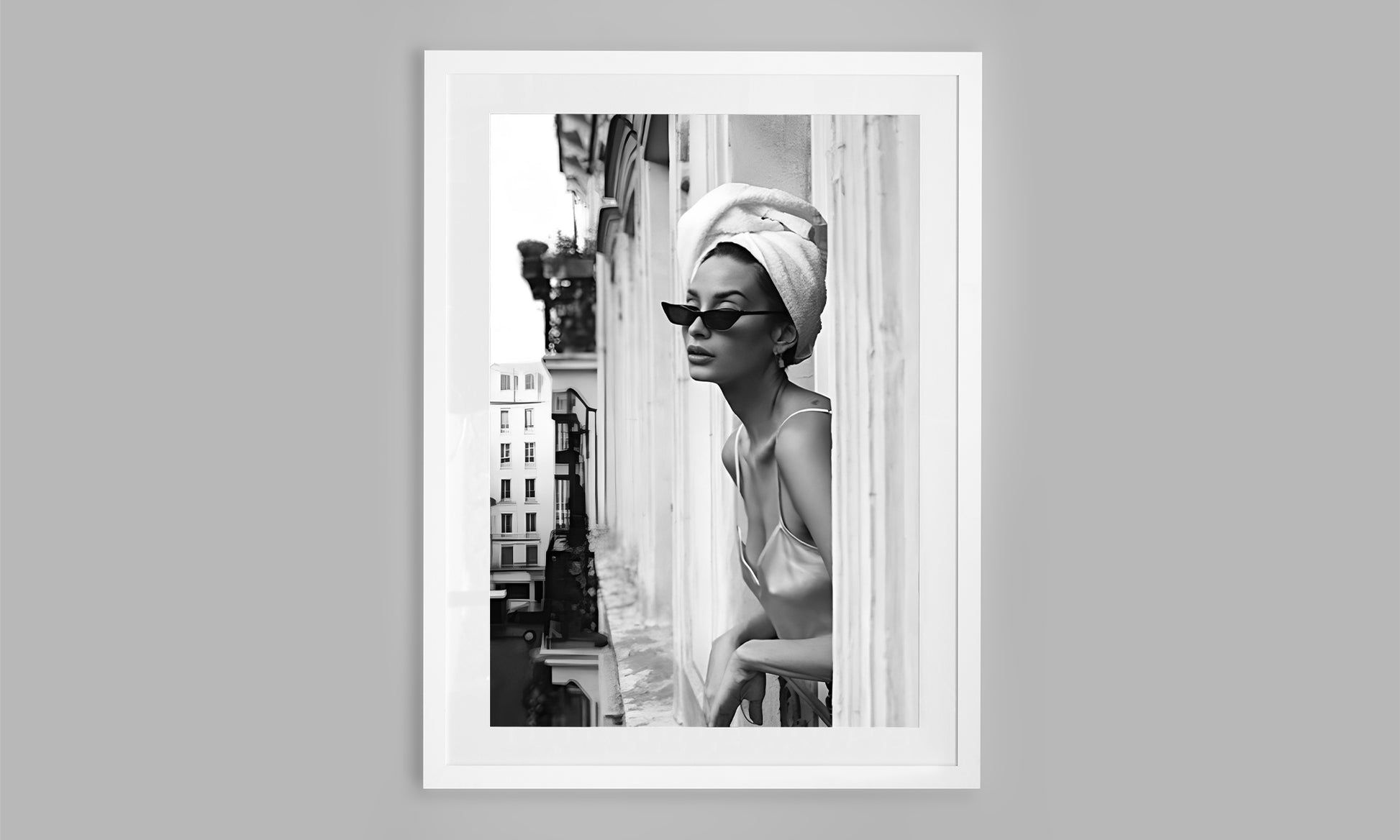This black-and-white portrait feels effortlessly chic, blending old-world architecture with modern confidence. It’s intimate without trying, glamorous without noise — the kind of image that belongs in a sunlit bedroom, dressing room, or calm living space.
