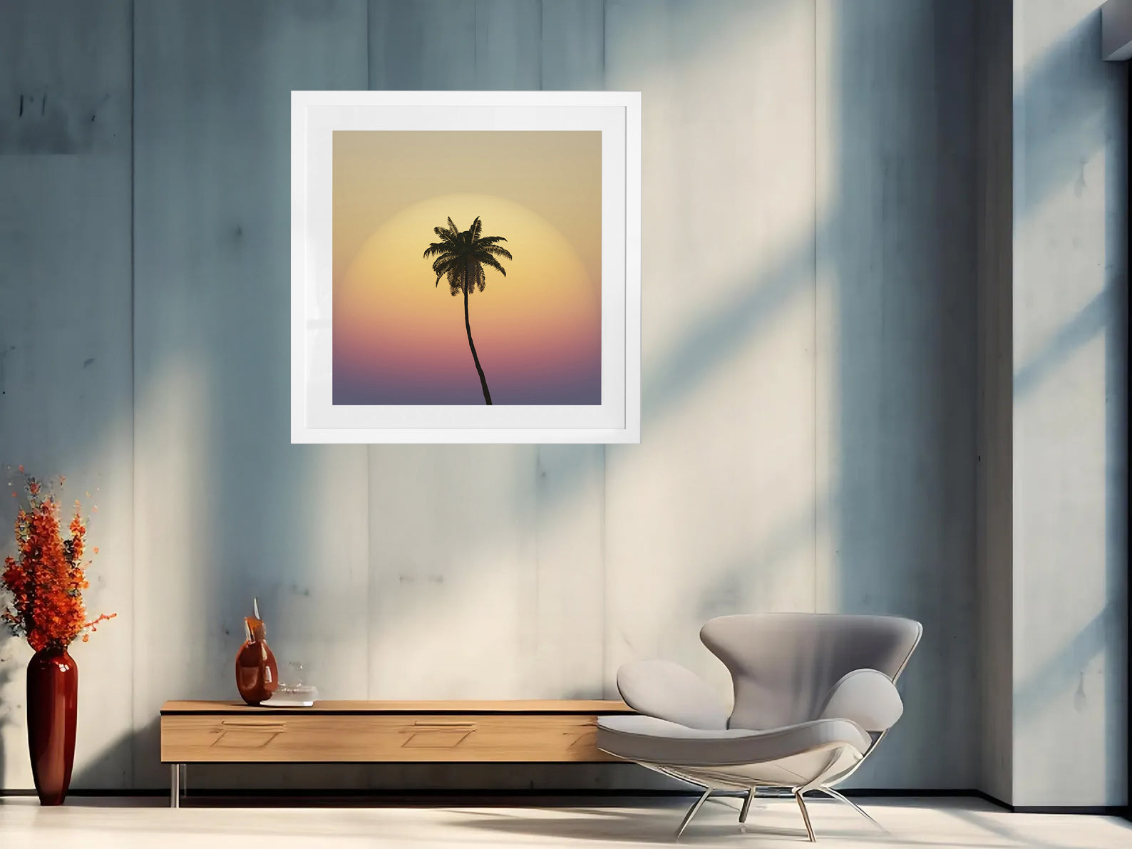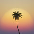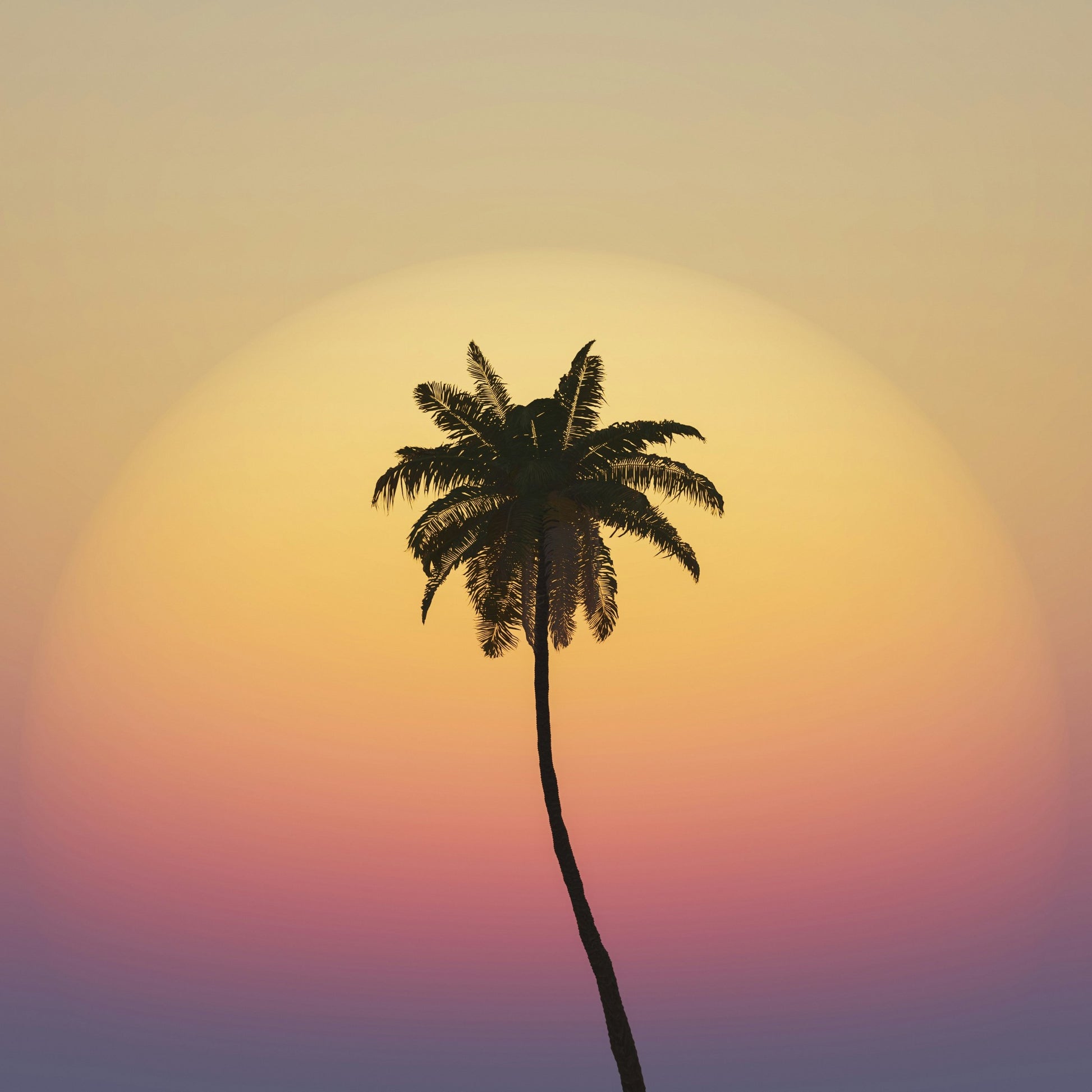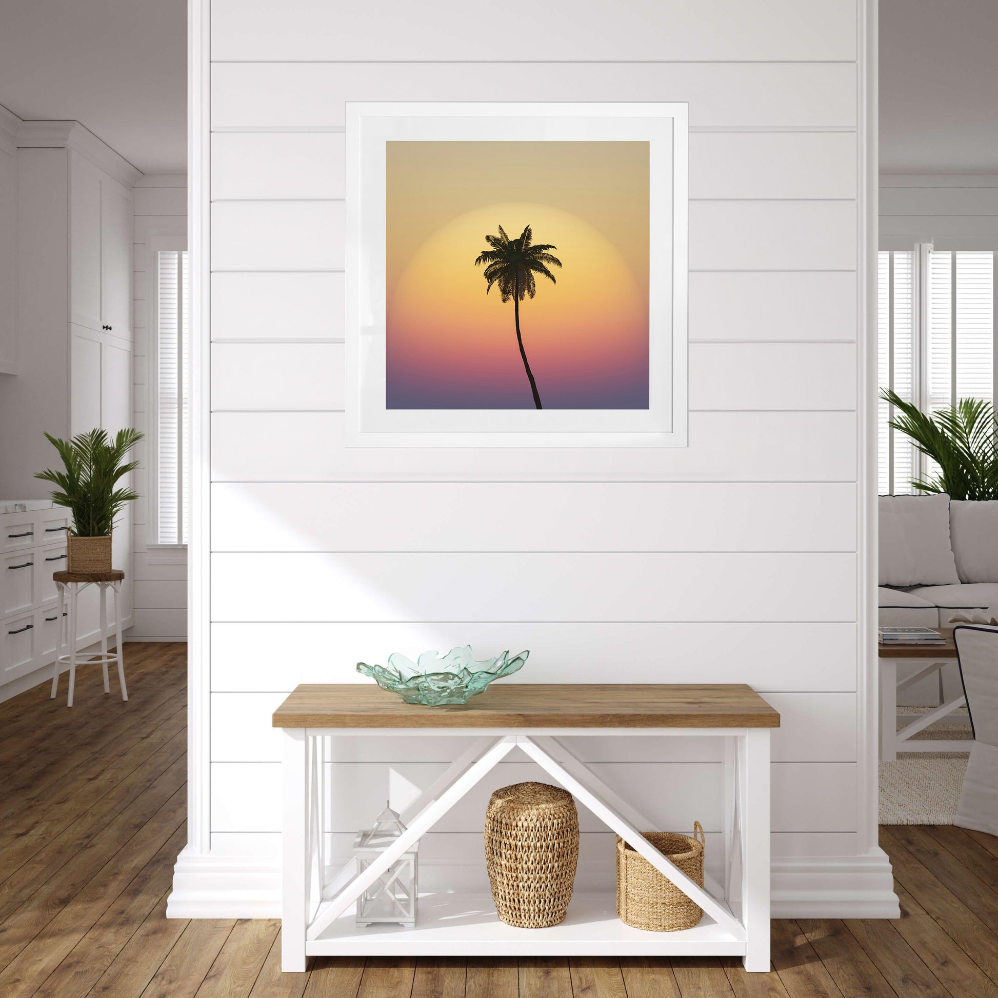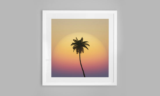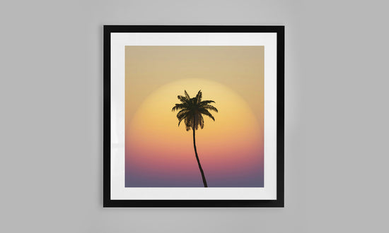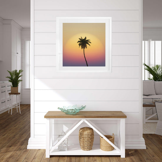 This print is pure tropical afterglow — a single palm silhouetted against layers of golden sky, just as the first cocktails are poured.