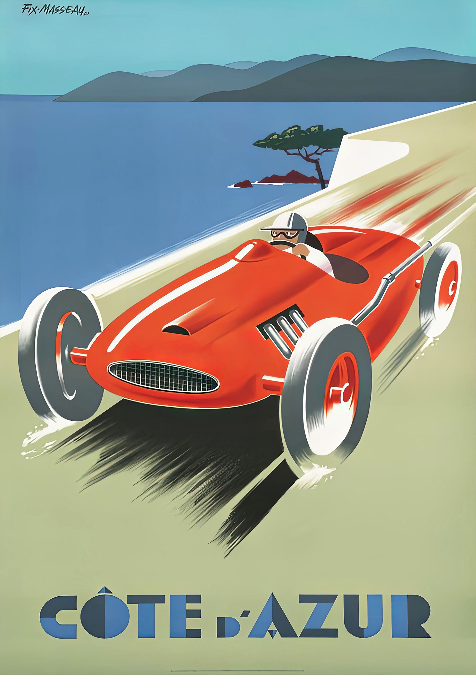 This vintage racing poster shows a red race car speeding along the famous blue coast of the French Riviera.