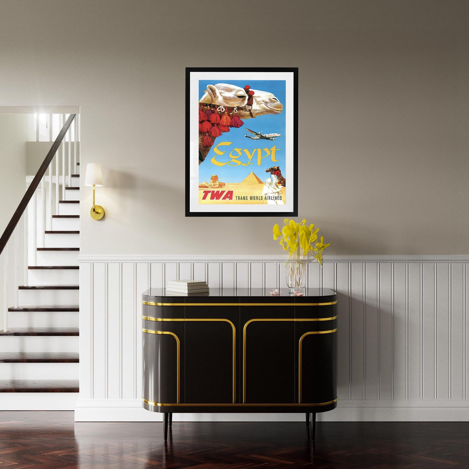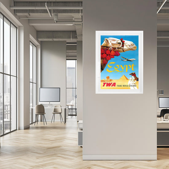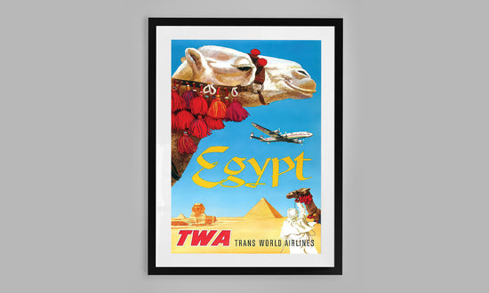 This Egypt poster was created circa 1960 by the gifted American artist David Klein (1918 -2005) for TWA. The image is dominated by a camel head with a very colorful tassel decorated harness, which stands out against a monochrome blue sky. On the lower left corner, a man is guiding another camel. In the far background, the viewer can distinguish a couple of pyramids and a sphinx that are distinctive monuments of Egypt.