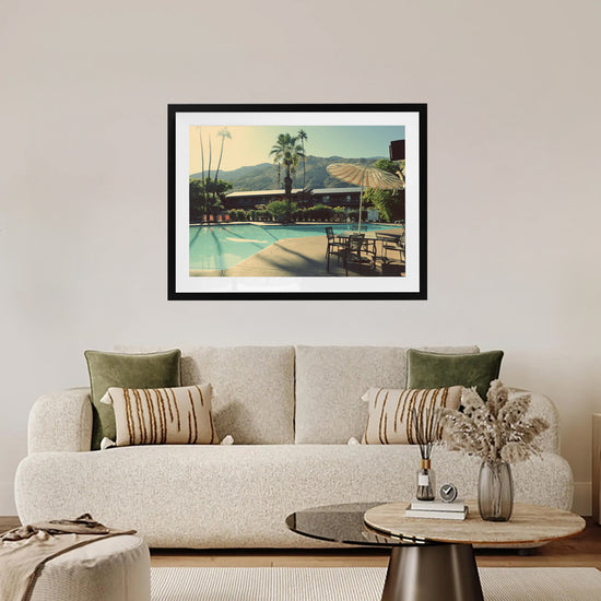 Perfect for anyone who dreams of sunshine, mid-century style, and slow days by the water. Hang it in your living room, bedroom, or office and instantly transport yourself to a golden-hour desert escape.