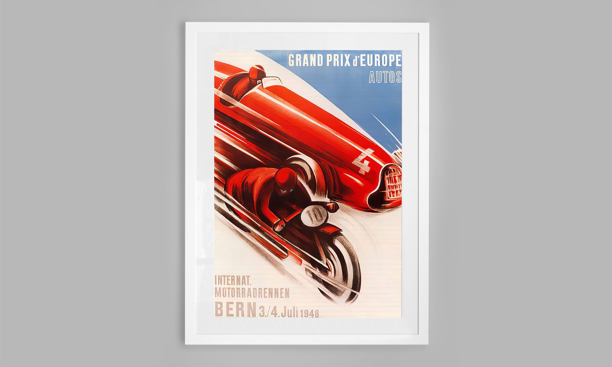 This vintage print captures the excitement and thrill of the European Grand Prix, set to take place in Bern on 3rd and 4th July 1948. The poster for this prestigious event showcases the essence of speed, racing, and motor sport at its finest.
