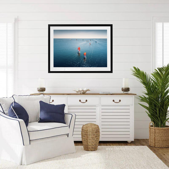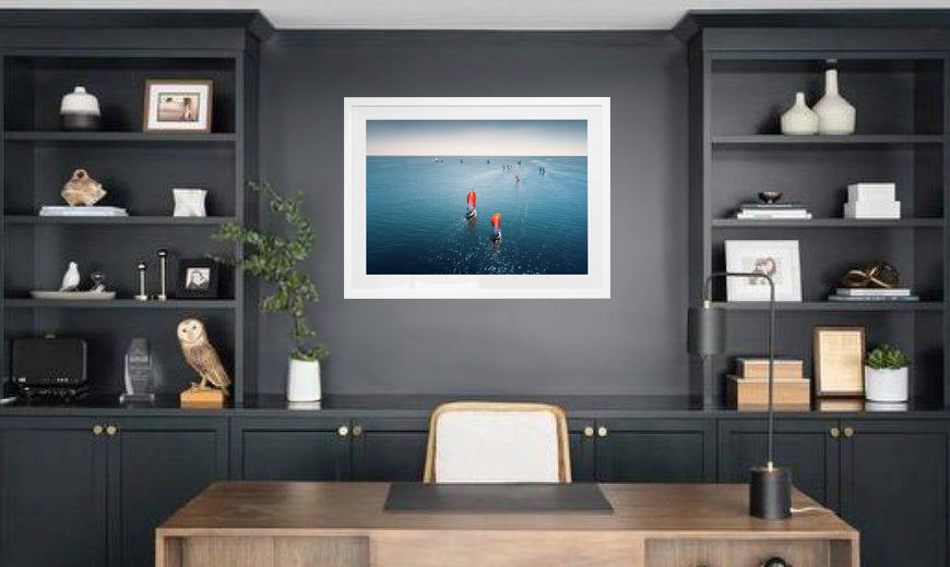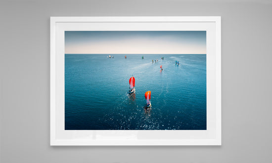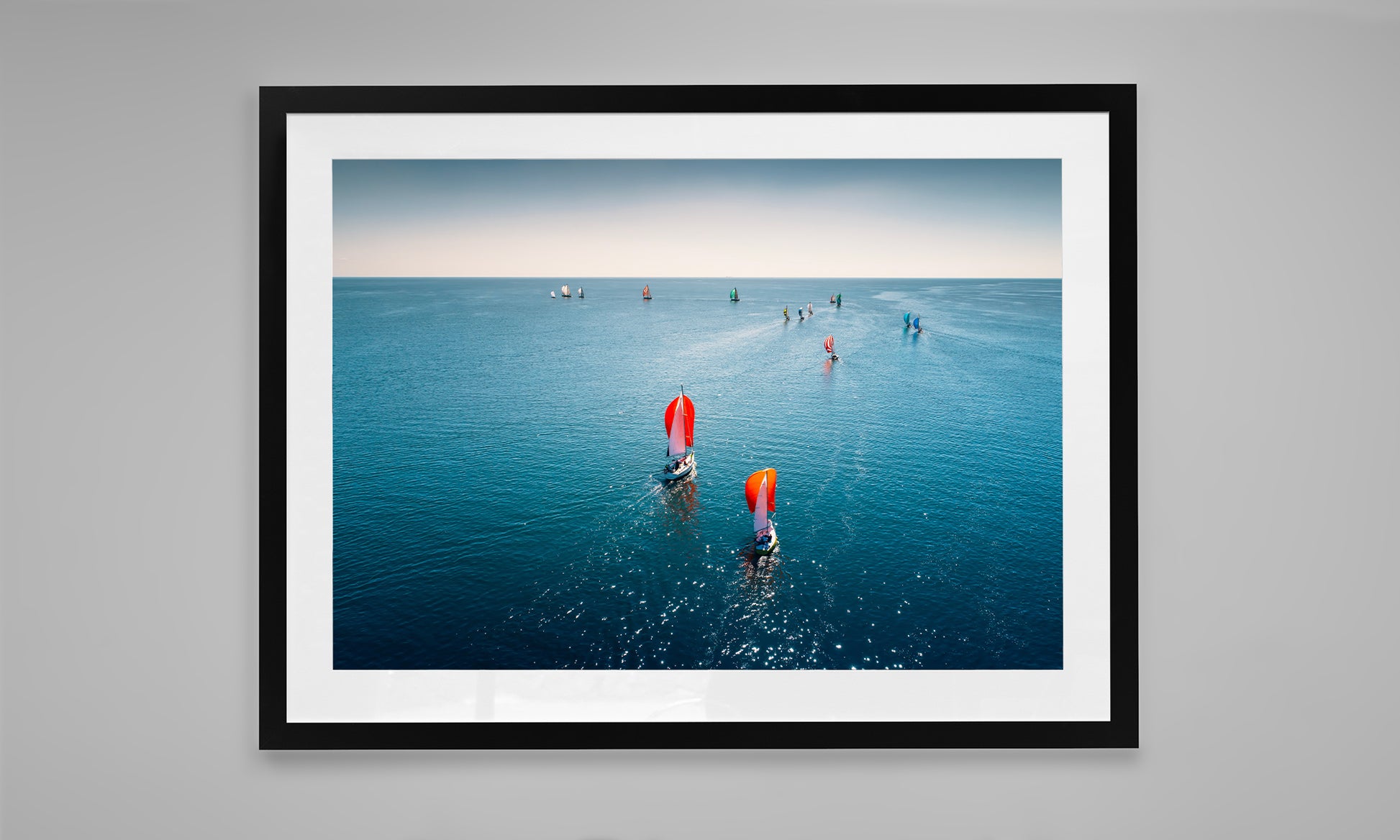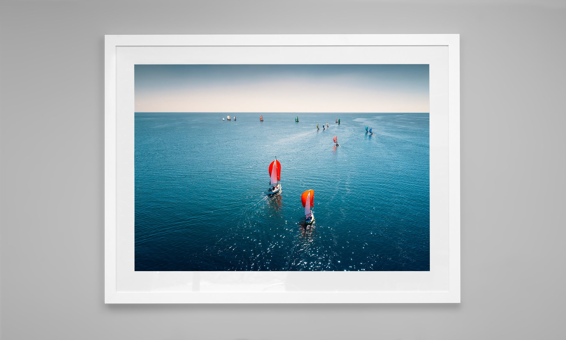 Bring the calm, sun-soaked rhythm of the open sea into your home. Into the Blue captures a fleet of colourful yachts drifting across a vast, glassy ocean—bright sails glowing against deep turquoise water. There’s a sense of freedom here, of warm air, gentle movement and long summer days that never seem to end.