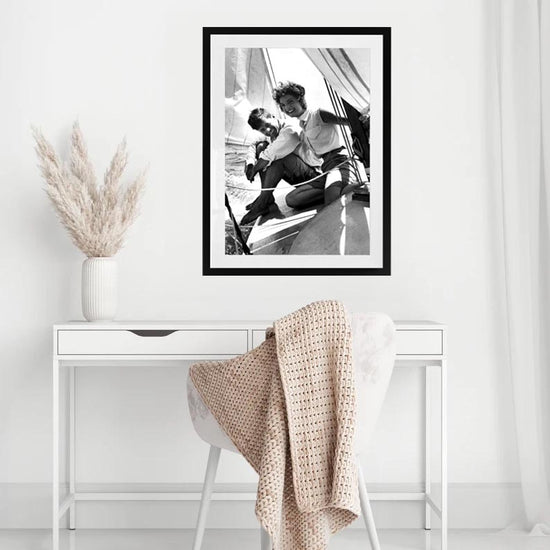 This photo was taken while they were engaged, Jackie joined JFK on his sailboat during a visit to Cape Cod. The future First Lady wears a sleeveless button-down blouse and high-waisted shorts.