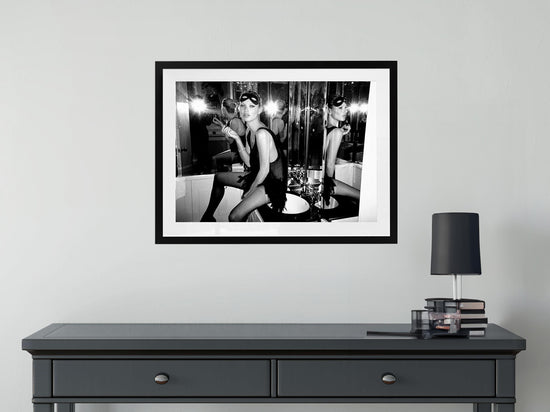 Fashion icon Kate Moss sitting on the sink, applying lipstick back-stage at a Fashion Show in London in 2006.