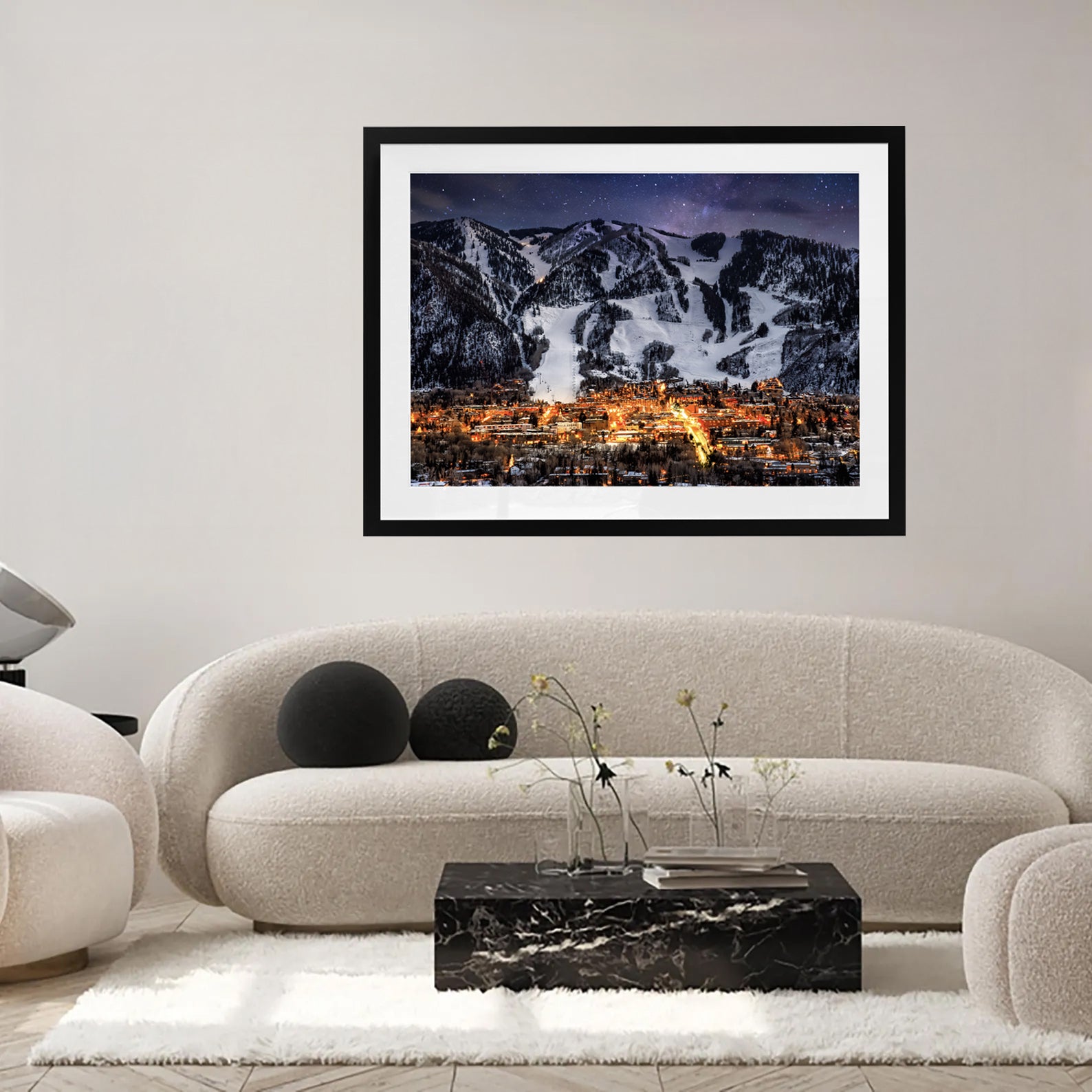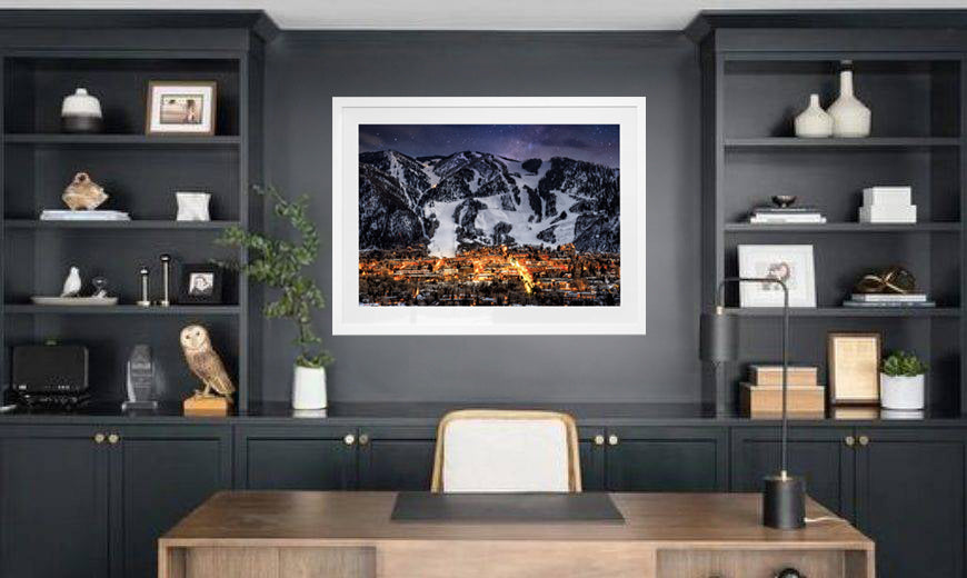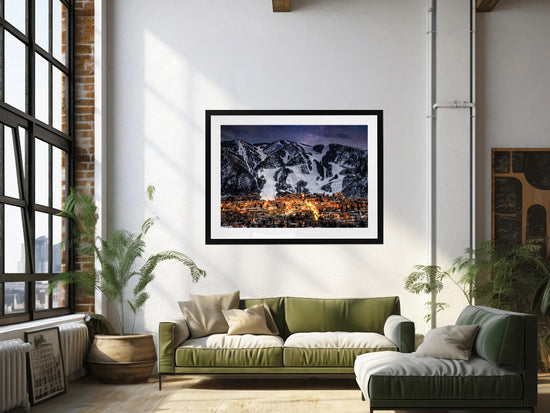 This image captures the magic of a ski town after dark — dramatic, alive, and quietly electric. The contrast between warm lights and cold mountain air gives it depth and atmosphere, making it a striking statement piece for living spaces, offices, or anywhere you want a sense of adventure.