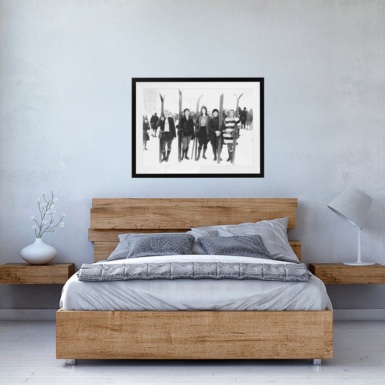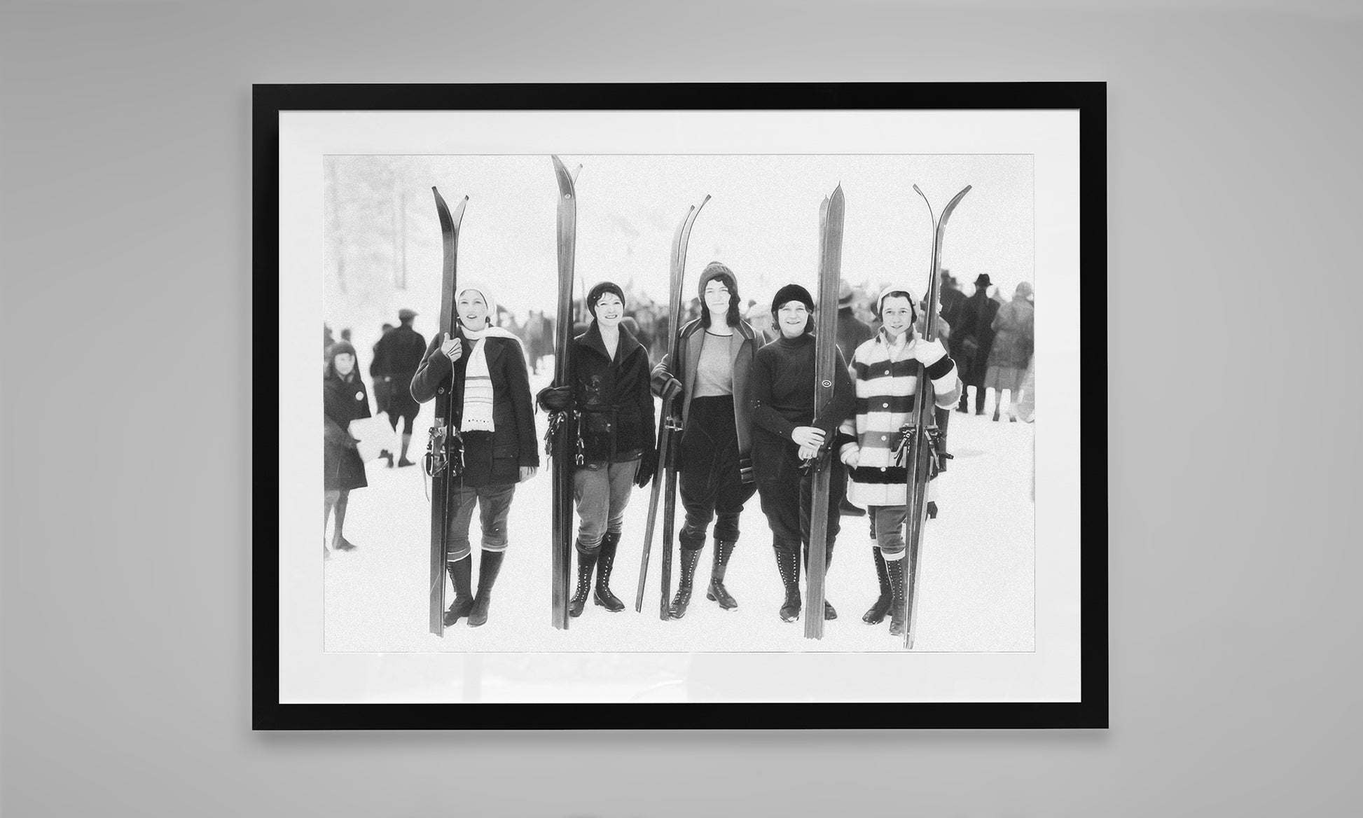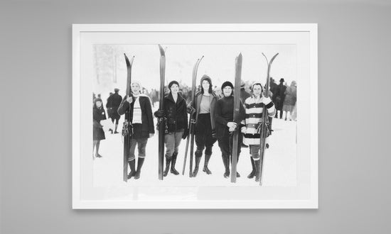Step back to the golden age of alpine glamour. Captured in the late 1920s, this timeless black-and-white photograph celebrates a group of stylish ski-club women posing proudly with their wooden skis. The mood is elegant, adventurous and effortlessly cool — a perfect statement piece for ski lovers, chalet interiors, and anyone who appreciates classic winter nostalgia.
