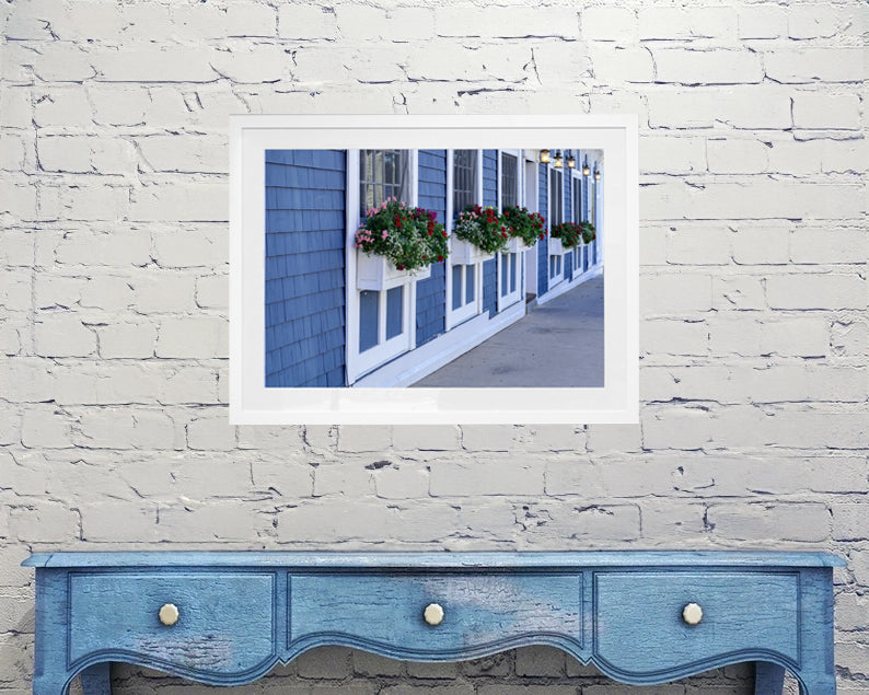 A charming row of blue-shingled windows, each topped with overflowing summer blooms — pinks, reds, and whites spilling out of crisp white flower boxes. This scene captures the gentle romance of coastal towns, where every home feels cared for and every window seems to greet the sun.