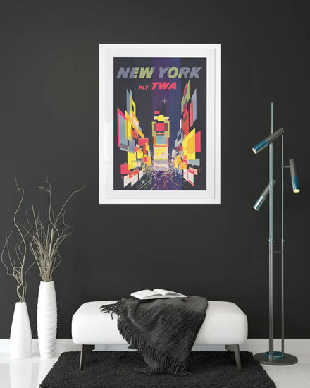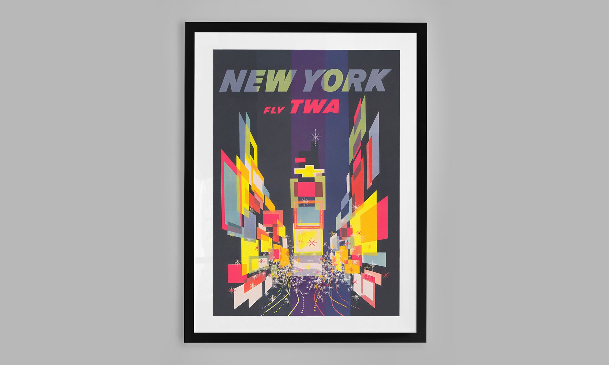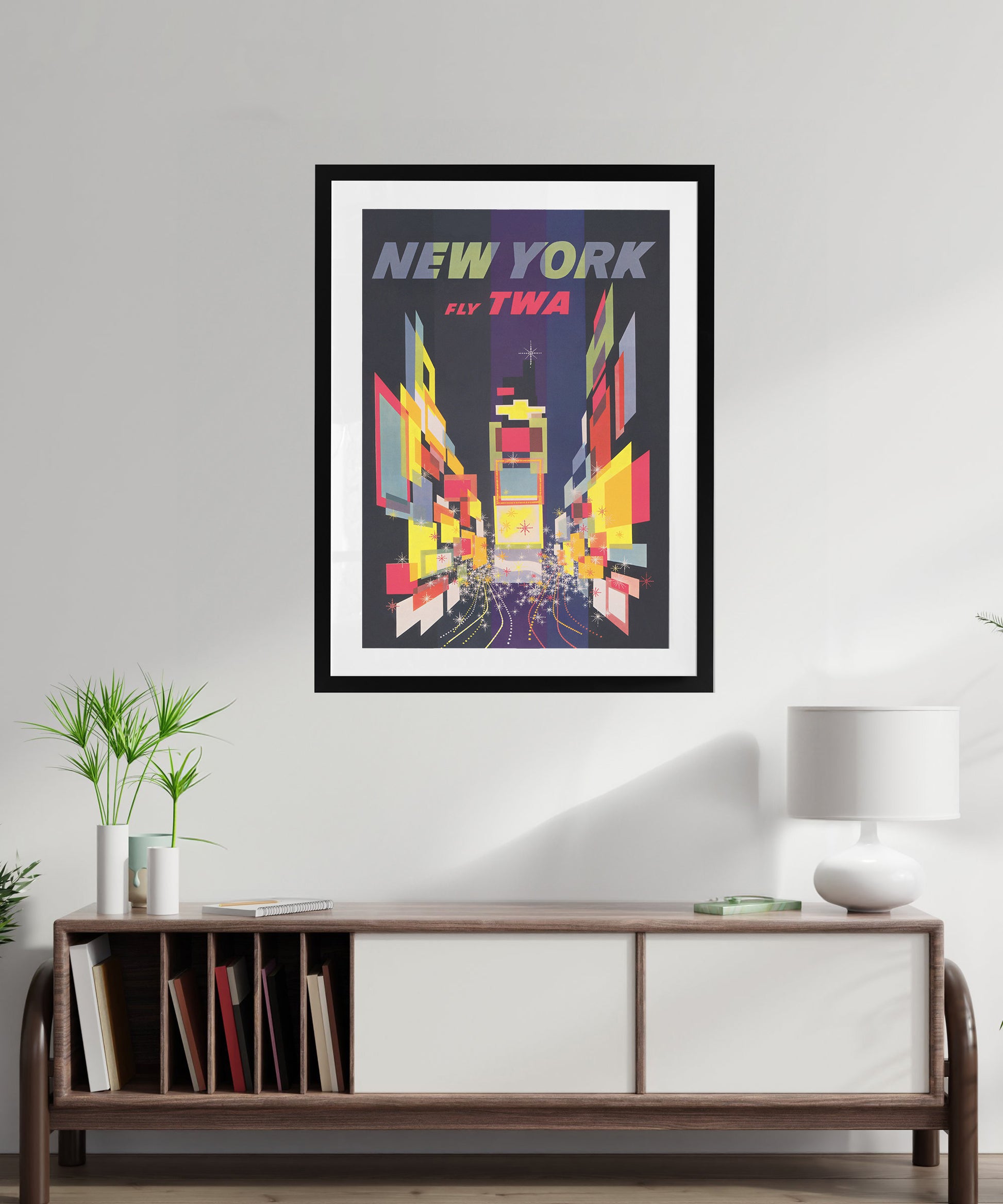 This is one of a series of great posters created by the noted American artist David Klein. Klein (1918 - 2005) produced illustrations for Broadway theatrical productions and Hollywood films, but is best remembered for the iconic travel images he created for Howard Hughes and Trans World Airlines (TWA) during the 1950s and 1960s. This graphic for travel to New York, features a vivid scene in the heart of Times Square. With its dramatic colors and neon signs, it was and remains a popular destination for all visitors.
