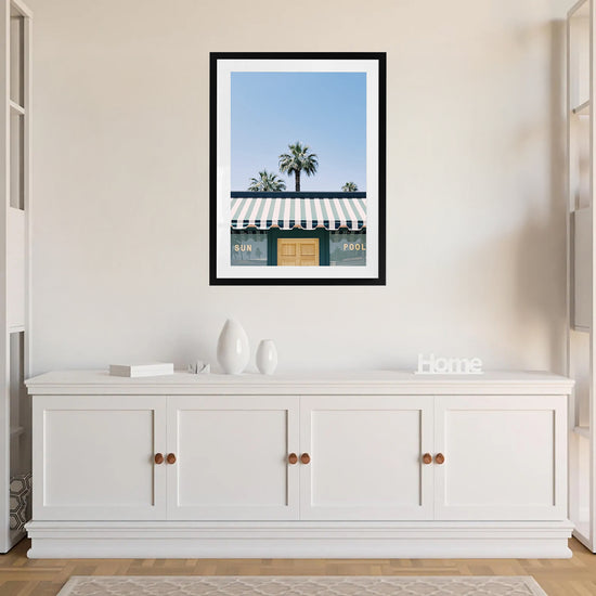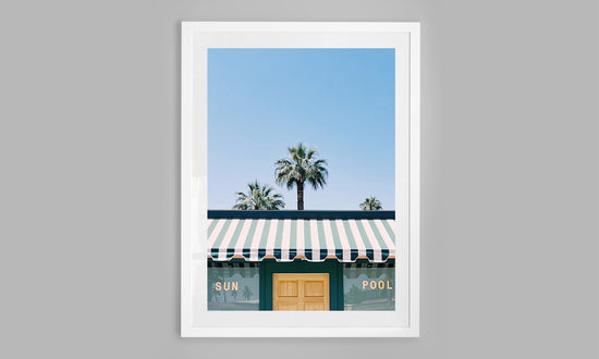 This clean, minimalist composition captures the essence of Palm Springs living — effortless, sun-soaked, and undeniably cool. The crisp striped awning, soft pastel tones, and perfectly framed palms create a scene that feels both nostalgic and modern.
