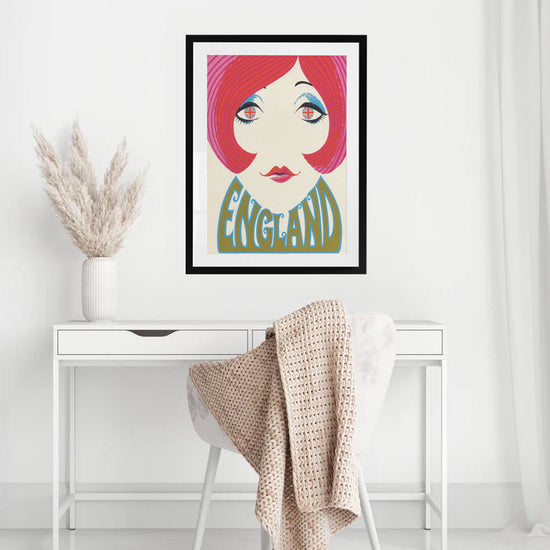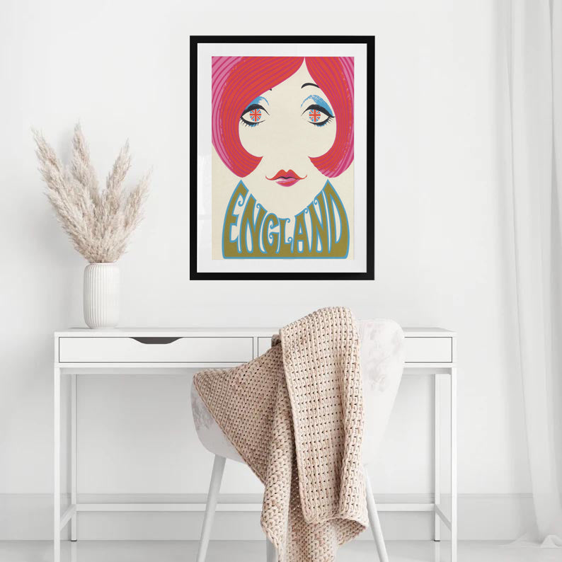 Step into the Swinging Sixties with this bold and playful England travel poster. A striking pop art beauty stares out with Union Jack eyes, framed by vibrant pink hair and retro typography. Bursting with energy and mod flair, this print captures the electric spirit of London’s cultural revolution. Perfect for lovers of vintage design, fashion, and British cool.