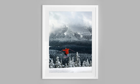 A skier arcs through cold alpine air, framed by snow-draped pines and distant, cloud-wrapped peaks. Everything is quiet. Focused. Free.
