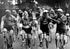 Captured during the Tour de France era of early European road racing, this powerful black-and-white photograph offers a rare glimpse into cycling at its most raw and human.