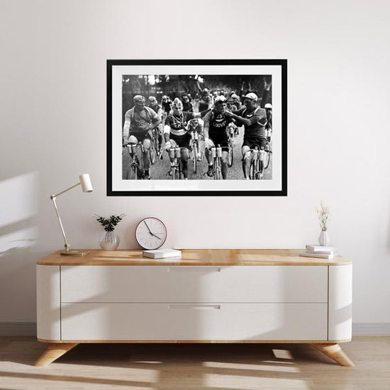 Timeless, textured, and full of quiet intensity, this image celebrates the grit and respect that shaped cycling’s golden age — a striking piece for collectors, sports lovers, and interiors that value history and authenticity.