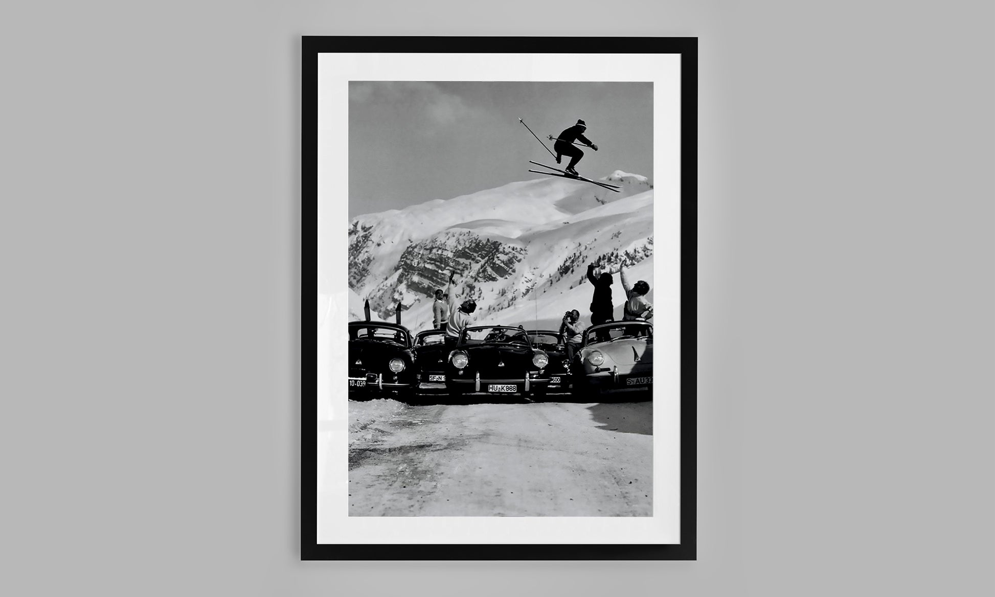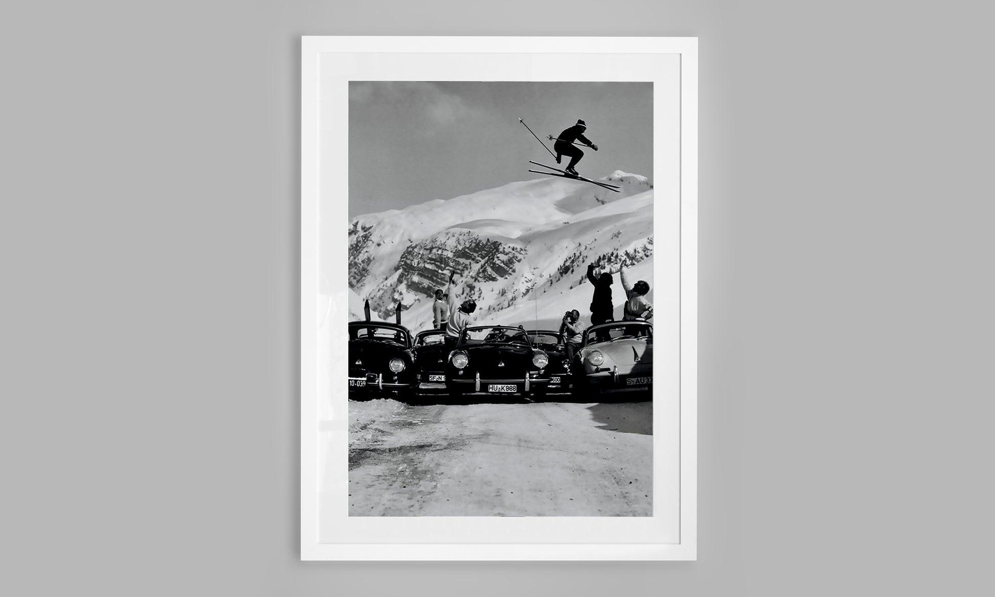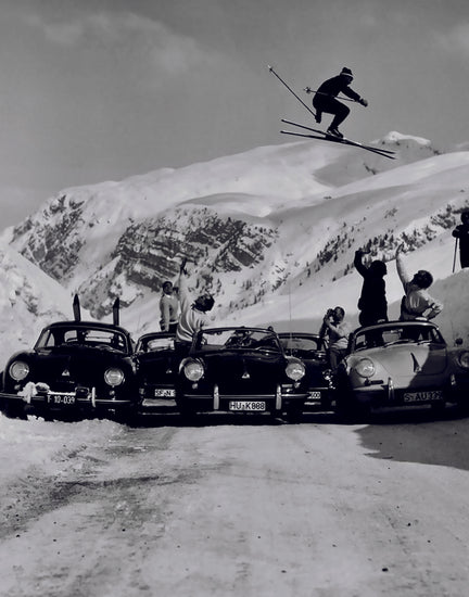 A daring skier launches into the air, soaring above a row of classic Porsches while friends cheer beneath him — the perfect collision of alpine adventure and retro cool.