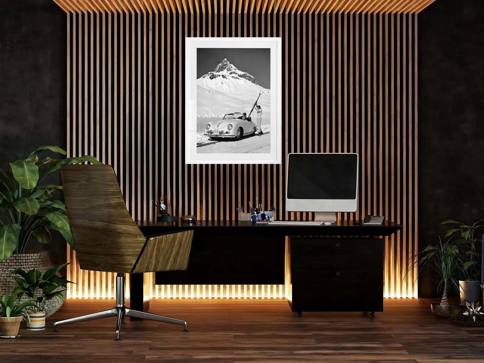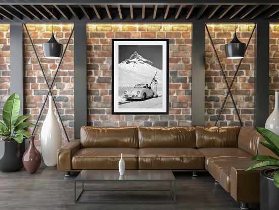 This black-and-white photograph celebrates the romance of winter travel — where style meets spontaneity and the journey is just as memorable as the destination. Clean lines, soft shadows, and dramatic alpine scale make this a striking print for modern interiors, ski lodges, or lovers of timeless design.