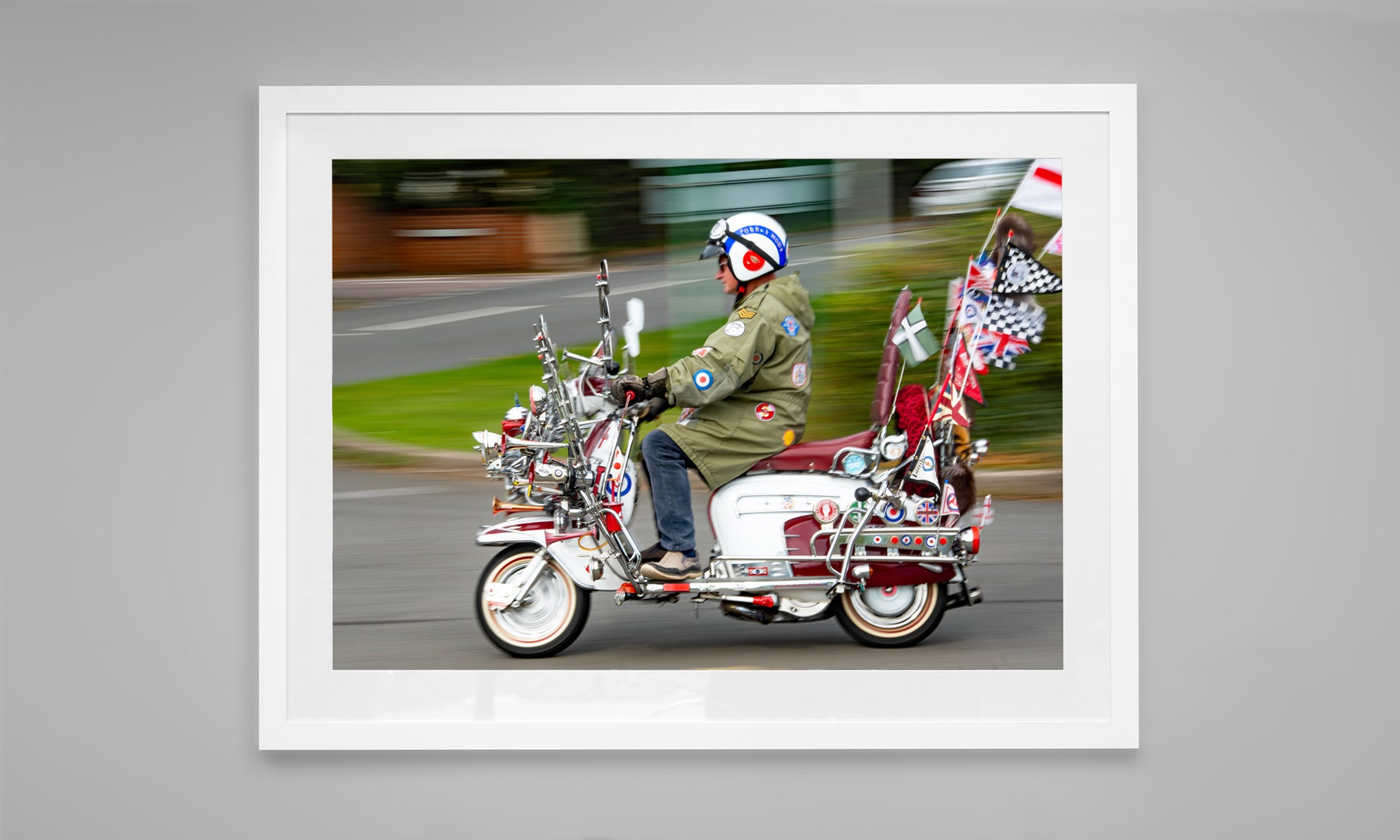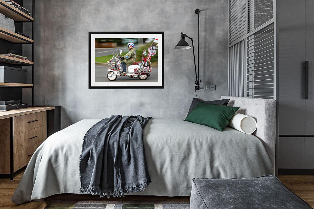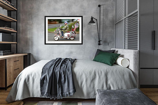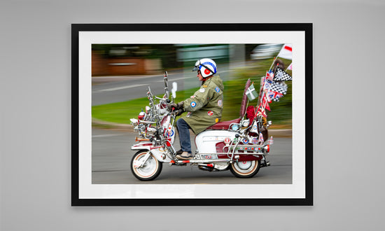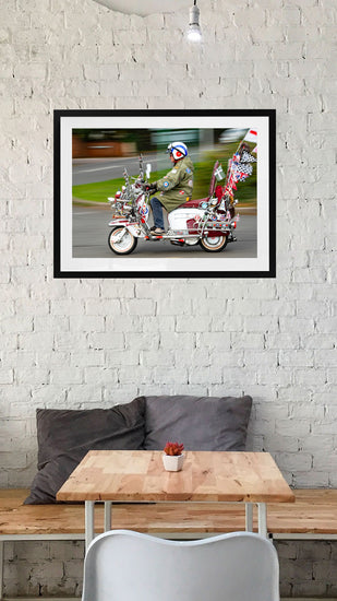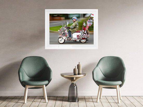 A celebration of pure Mod culture — chrome, badges, patches, mirrors, and a rider who looks like he’s rolled straight out of the Swinging Sixties. This print captures the unmistakable spirit of British scooter culture: proud, loud, and beautifully over-the-top.