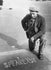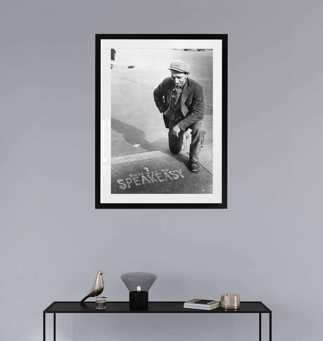 Kneeling on the pavement, a man studies a chalk message pointing the way to a hidden speakeasy — a playful reminder of the secret drinking dens that flourished during the Prohibition era. His worn jacket, flat cap, and cigarette capture the character of everyday life in the early twentieth century.