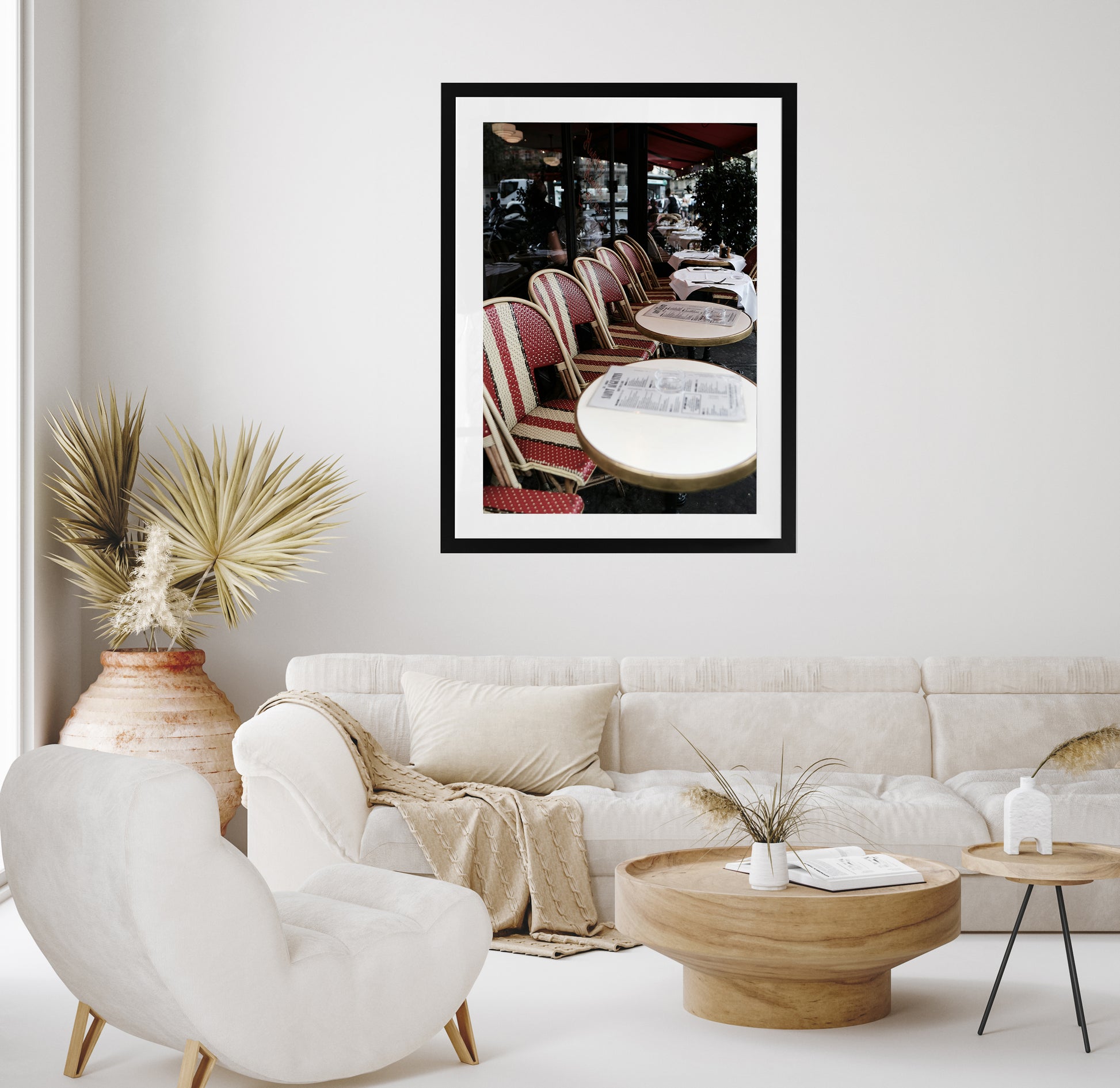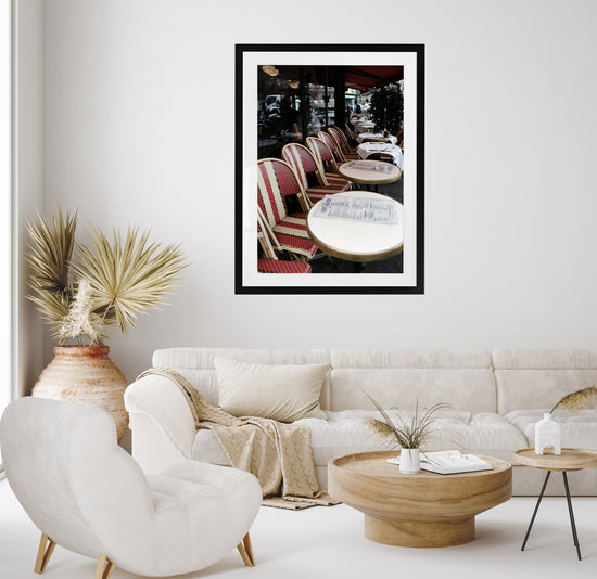 Transport yourself to a quiet Parisian afternoon with "Table for Two in Paris". This elegant print captures the stillness and intimacy of a classic café scene—striped red bistro chairs, crisp linens, and soft light filtering under a ruby awning. A perfect piece for lovers of European charm, slow moments, and timeless romance.