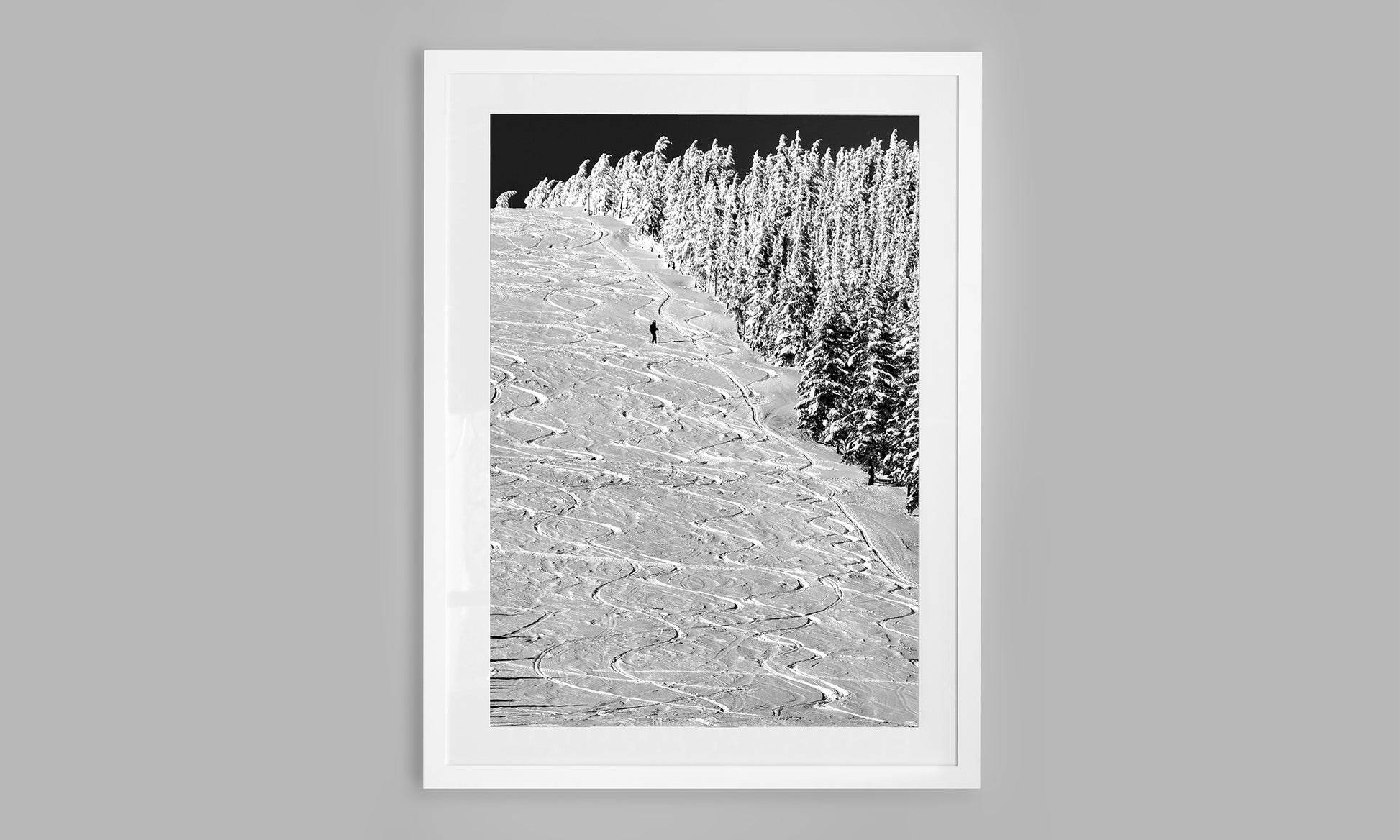 Tracks of Tranquility captures the pure magic of a fresh powder morning — untouched snow, soft curves of ski lines, and the quiet presence of a lone skier moving across the slope.