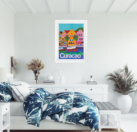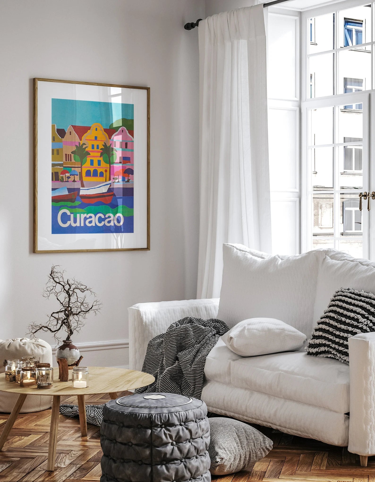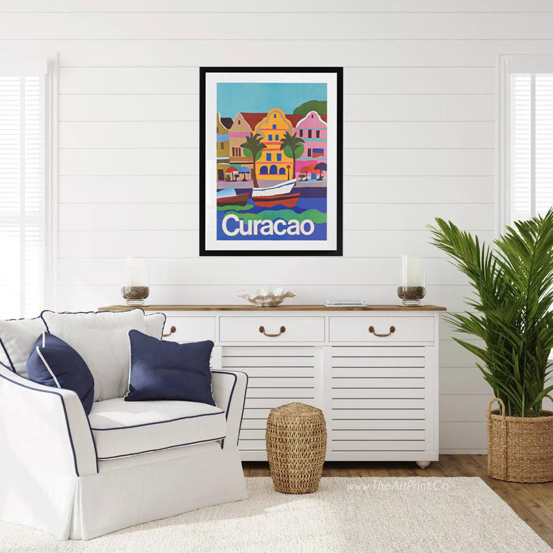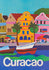 Curaçao is a Dutch Caribbean island known for its beaches tucked into coves and its expansive coral reefs rich with marine life. The capital, Willemstad, has pastel-colored colonial architecture which is depicted in this vintage travel poster.